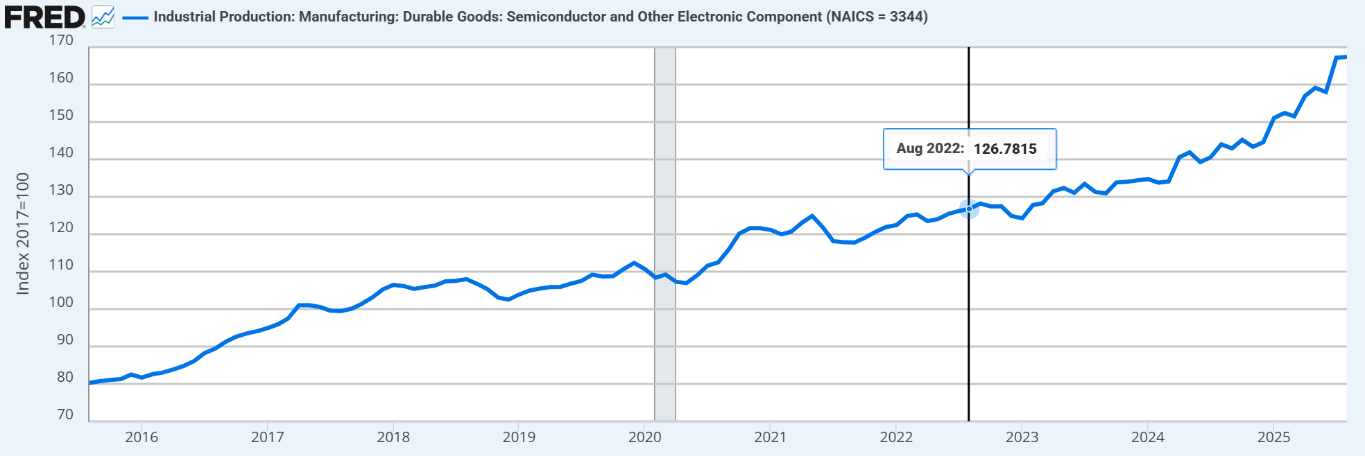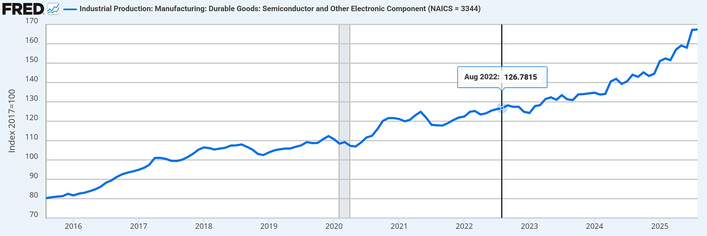 In anticipation of the CHIPs Act passing, manufacturing construction spending already began to surge in 2021, peaking in August of 2024, while actual semiconductor production began a contemporaneous increase. It could be considered good luck or mysterious planning that this “capacity-building” also contributes to the overall capacity to build AI data centers, which drove more than a full percentage of US GDP growth in the first half of 2025.